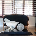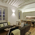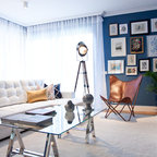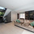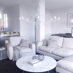 На фото: открытая гостиная комната в стиле фьюжн с белыми стенами, полом из керамической плитки, отдельно стоящим ТВ и белым полом — Houzz