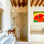 Стильный дизайн: главная ванная комната среднего размера в средиземноморском стиле с настольной раковиной, плоскими фасадами, бежевыми фасадами, отдельно стоящей ванной, белыми стенами, паркетным полом среднего тона и коричневым полом - последний тренд — Houzz