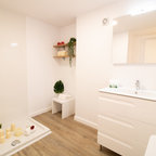 Me encanta la puerta, piso, lavamanos y espejo