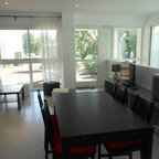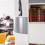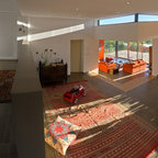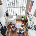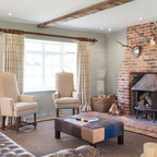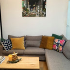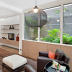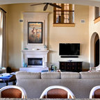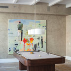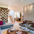 Неиссякаемый источник вдохновения для домашнего уюта: открытая гостиная комната среднего размера в стиле фьюжн с домашним баром, серыми стенами, деревянным полом и серым полом без камина, ТВ — Houzz