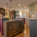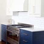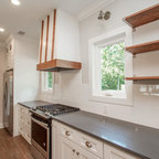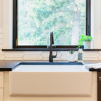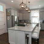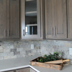 На фото: большие отдельные, линейные кухни в стиле кантри с раковиной в стиле кантри, фасадами с выступающей филенкой, серыми фасадами, мраморной столешницей, бежевым фартуком, фартуком из каменной плитки, техникой из нержавеющей стали, полом из керамогранита и серым полом — Houzz