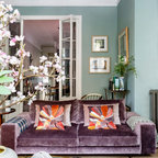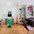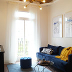 На фото: парадная, открытая гостиная комната среднего размера в стиле фьюжн с белыми стенами и светлым паркетным полом без камина, ТВ с — Houzz