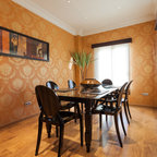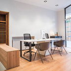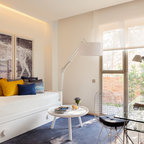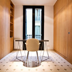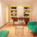 Пример оригинального дизайна: маленькое рабочее место в стиле фьюжн с бежевыми стенами, светлым паркетным полом и отдельно стоящим рабочим столом без камина — Houzz
