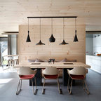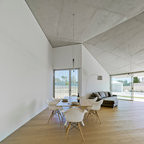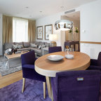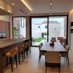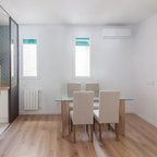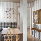 Источник вдохновения для домашнего уюта: кухня-столовая среднего размера в современном стиле с белыми стенами и паркетным полом среднего тона без камина — Houzz
