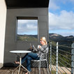 a full glass wall and a patio deck