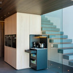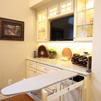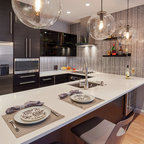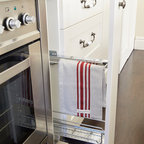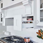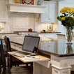 The large granite island countertop creates a dedicated space for food preparation as well as for baking. Custom pull-out drawers were incorporated into the island as a place for laptop storage. A unique backsplash above the range was designed with 3” x 6” field tile, outlined by a liner bar, to draw the eyes attention to the custom Grabill hood.