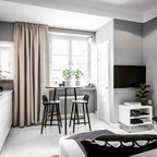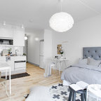 На фото: маленькие открытые гостиные комнаты в скандинавском стиле с белыми стенами, телевизором на стене, серым полом и бетонным полом — Houzz