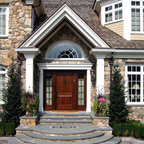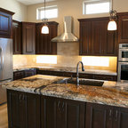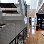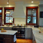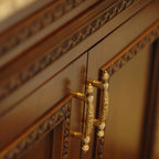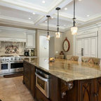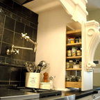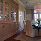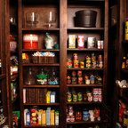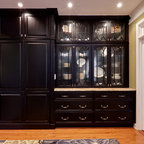 Выдающиеся фото от архитекторов и дизайнеров интерьера: кухня в классическом стиле с стеклянными фасадами, черными фасадами и кладовкой — Houzz