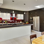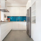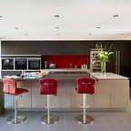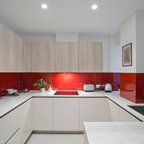 Пример оригинального дизайна: кухня в современном стиле с врезной раковиной, плоскими фасадами, белыми фасадами, красным фартуком, фартуком из стекла и техникой из нержавеющей стали — Houzz