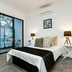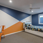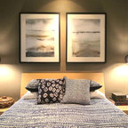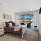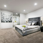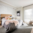 На фото: большая хозяйская спальня в современном стиле с серыми стенами и ковровым покрытием без камина с — Houzz