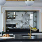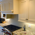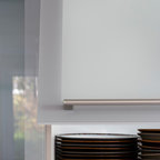 На фото: параллельная кухня-гостиная в классическом стиле с фасадами с декоративным кантом, белыми фасадами, фартуком цвета металлик, фартуком из стекла, техникой из нержавеющей стали, светлым паркетным полом и бежевым полом с — Houzz