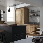 Two different colour cabinets love stools like the idea of breakfast bar and being able to watch the cooking happening