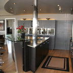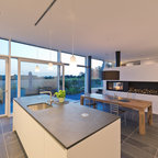 Пример оригинального дизайна: кухня в современном стиле с обеденным столом, плоскими фасадами, серыми фасадами, серым фартуком и техникой из нержавеющей стали — Houzz