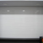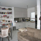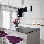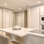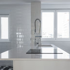 Идея дизайна: угловая кухня среднего размера в стиле модернизм с обеденным столом, врезной раковиной, плоскими фасадами, белыми фасадами, белым фартуком, техникой из нержавеющей стали и островом — Houzz