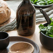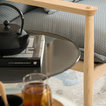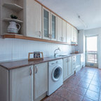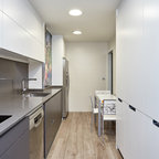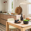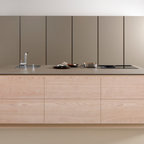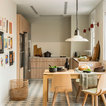Стильный дизайн: линейная кухня-гостиная среднего размера с врезной раковиной, плоскими фасадами, фасадами цвета дерева среднего тона, деревянной столешницей, бежевым фартуком, фартуком из керамической плитки, техникой из нержавеющей стали, паркетным полом среднего тона, коричневым полом и коричневой столешницей - последний тренд — Houzz