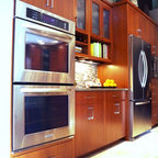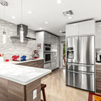 Неиссякаемый источник вдохновения для домашнего уюта: параллельная кухня в современном стиле с врезной раковиной, плоскими фасадами, белыми фасадами и темным паркетным полом — Houzz