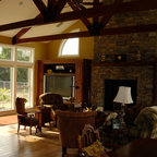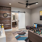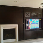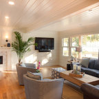 Удачное сочетание для дизайна помещения: открытая гостиная комната в современном стиле с зелеными стенами, паркетным полом среднего тона, камином, телевизором на стене и коричневым полом - самое интересное для вас — Houzz