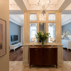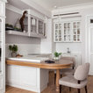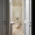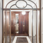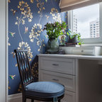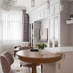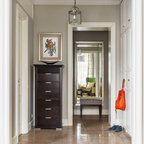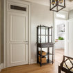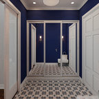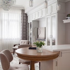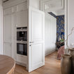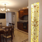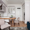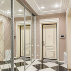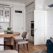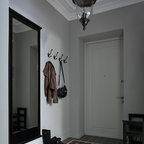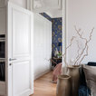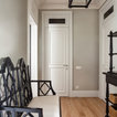 ПРИХОЖАЯЧтобы не дробить небольшую квартиру, пол во всех зонах оформили единым материалом — недорогим дубовым паркетом. Акценты расставили с помощью тёмной мебели — резной скамьи и деревянного стеллажа.Закрытых шкафов здесь нет: они не вписывались ни по бюджету, ни по метражу. Зато из прихожей можно попасть в небольшую прачечную и гардероб для верхней одежды — этот позволило разгрузить входную зону.Все двери в интерьере одинаковые — увеличенной высоты и с прозрачными фрамугами. Благодаря остеклению в темные части квартиры проникает естественный свет — даже если дверь плотно закрыта.