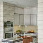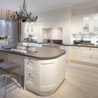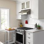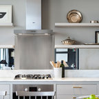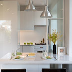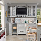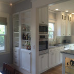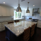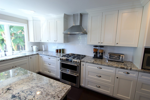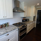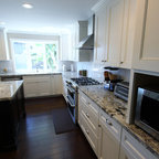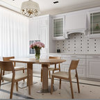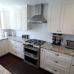 Идея дизайна: большая угловая кухня в стиле современная классика с обеденным столом, одинарной раковиной, фасадами с утопленной филенкой, белыми фасадами, гранитной столешницей, белым фартуком, фартуком из керамической плитки, техникой из нержавеющей стали и темным паркетным полом — Houzz