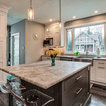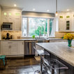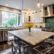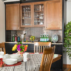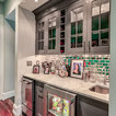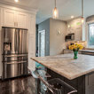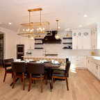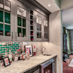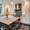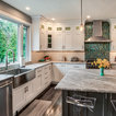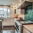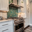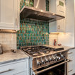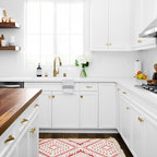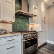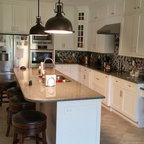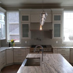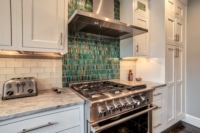 Пример оригинального дизайна: угловая кухня среднего размера в стиле современная классика с кладовкой, раковиной в стиле кантри, фасадами в стиле шейкер, белыми фасадами, мраморной столешницей, синим фартуком, фартуком из керамогранитной плитки, техникой из нержавеющей стали, полом из керамогранита, разноцветным полом и белой столешницей — Houzz