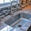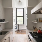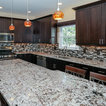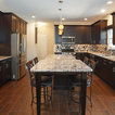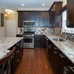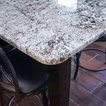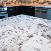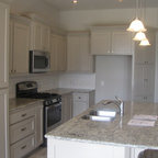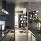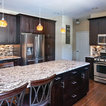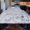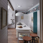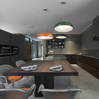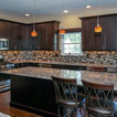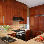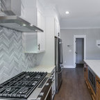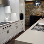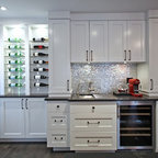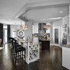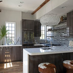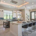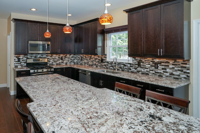 Идея дизайна: большая угловая кухня в стиле современная классика с обеденным столом, врезной раковиной, гранитной столешницей, разноцветным фартуком, фартуком из стеклянной плитки, техникой из нержавеющей стали и островом — Houzz