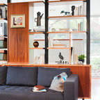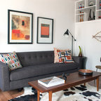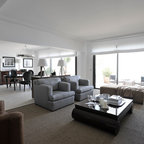 Пример оригинального дизайна интерьера: открытая гостиная комната среднего размера в стиле фьюжн с белыми стенами, светлым паркетным полом, камином, фасадом камина из штукатурки, бежевым полом и скрытым ТВ — Houzz