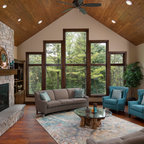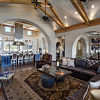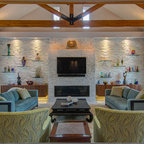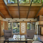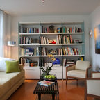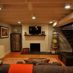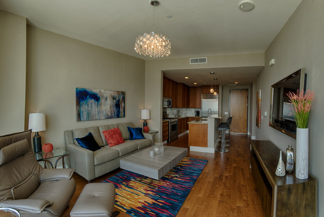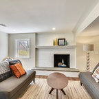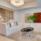 Новый формат декора квартиры: двухуровневая гостиная комната среднего размера в современном стиле с бежевыми стенами, паркетным полом среднего тона и телевизором на стене — Houzz