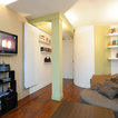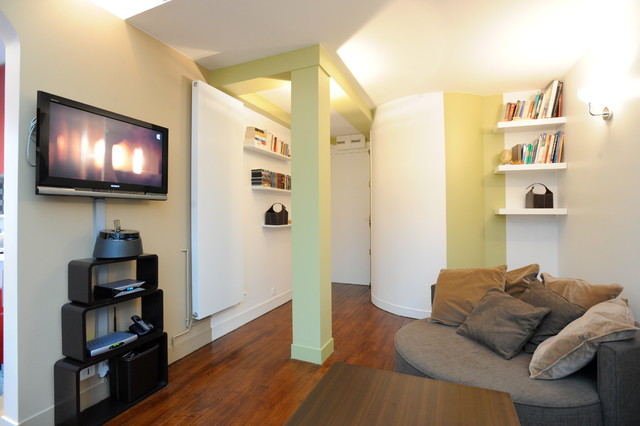 Новый формат декора квартиры: маленькая открытая гостиная комната в стиле фьюжн с зелеными стенами, паркетным полом среднего тона и телевизором на стене — Houzz