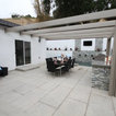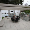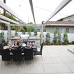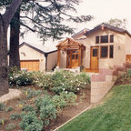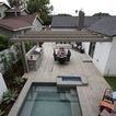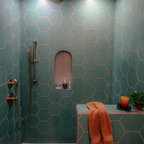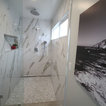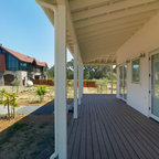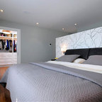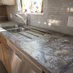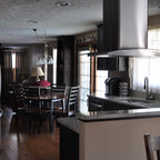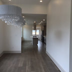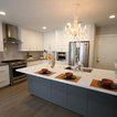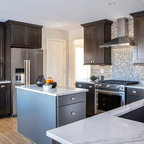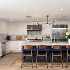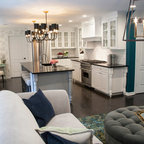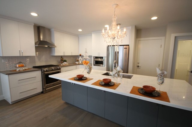 На фото: угловая кухня среднего размера в стиле современная классика с врезной раковиной, плоскими фасадами, белыми фасадами, столешницей из акрилового камня, белым фартуком, фартуком из керамической плитки, техникой из нержавеющей стали и паркетным полом среднего тона с — Houzz
