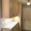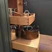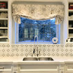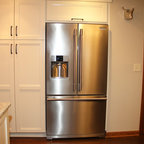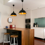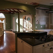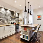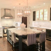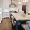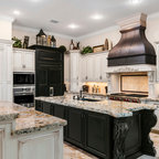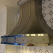 The custom range hood introduces a mix of three metal finishes in the body, strapping and accents.