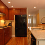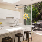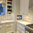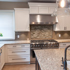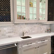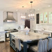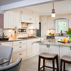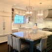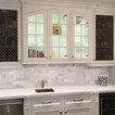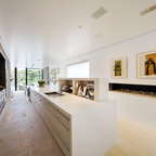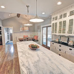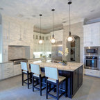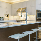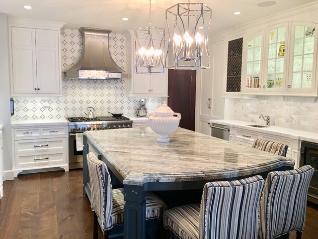 Идея дизайна: большая кухня-гостиная в стиле современная классика с двойной раковиной, фасадами с декоративным кантом, белыми фасадами, мраморной столешницей, белым фартуком, фартуком из мрамора, техникой под мебельный фасад, темным паркетным полом и островом — Houzz