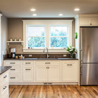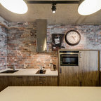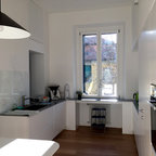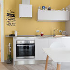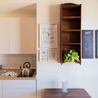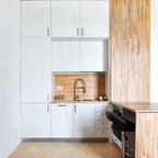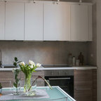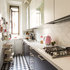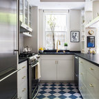 Новый формат декора квартиры: маленькая отдельная, угловая кухня в скандинавском стиле с плоскими фасадами, белым фартуком, техникой под мебельный фасад, полом из керамической плитки и разноцветным полом без острова — Houzz