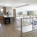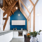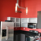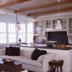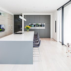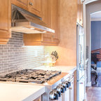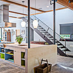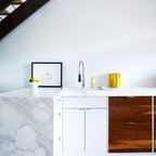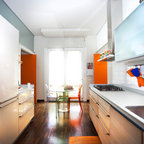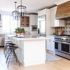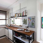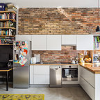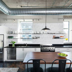 Новый формат декора квартиры: маленькая п-образная кухня-гостиная в стиле лофт с фасадами с утопленной филенкой, белыми фасадами, белым фартуком, фартуком из плитки кабанчик, техникой из нержавеющей стали, врезной раковиной, столешницей из кварцевого композита, паркетным полом среднего тона и полуостровом — Houzz
