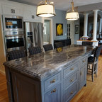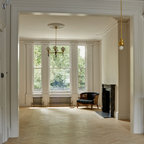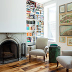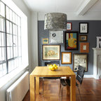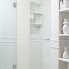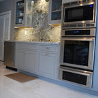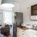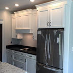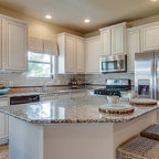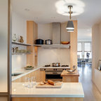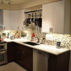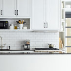 Неиссякаемый источник вдохновения для домашнего уюта: маленькая п-образная кухня - столовая в стиле современная классика с одинарной раковиной, фасадами с утопленной филенкой, белыми фасадами, столешницей из кварцевого композита, белым фартуком, фартуком из керамической плитки, техникой из нержавеющей стали, паркетным полом среднего тона и полуостровом — Houzz
