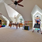 Family bonus room with slanted ceilings. Custom built ins and daybed create a great place to hang out with the kids and a comfortable space for an overnight guest.