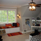 Family bonus room with slanted ceilings. Custom built ins and daybed create a great place to hang out with the kids and a comfortable space for an overnight guest.