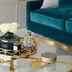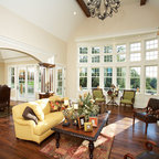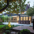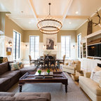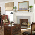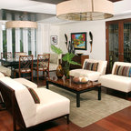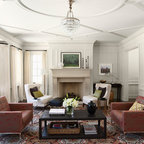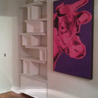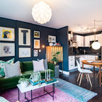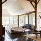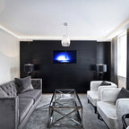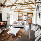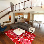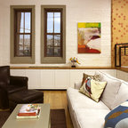 Пример оригинального дизайна интерьера: гостиная комната среднего размера в современном стиле с белыми стенами и паркетным полом среднего тона — Houzz