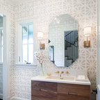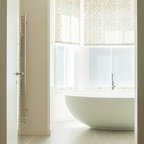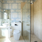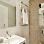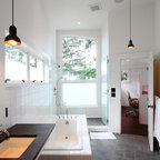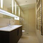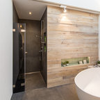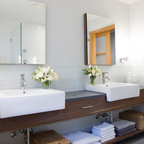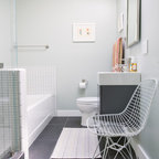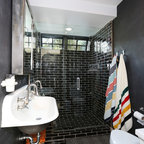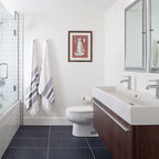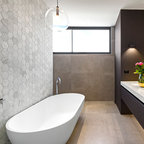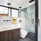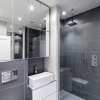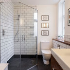 Пример оригинального дизайна интерьера: ванная комната в современном стиле с монолитной раковиной, плоскими фасадами, фасадами цвета темного дерева, угловым душем, белой плиткой, белыми стенами и серым полом — Houzz