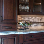 Новые идеи обустройства дома: кухня - столовая в классическом стиле с стеклянными фасадами, белыми фасадами, столешницей из дерева, белой техникой, врезной раковиной и белым фартуком — Houzz