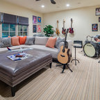 Family bonus room with slanted ceilings. Custom built ins and daybed create a great place to hang out with the kids and a comfortable space for an overnight guest.