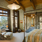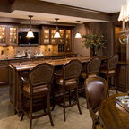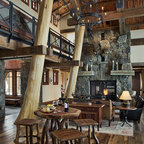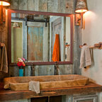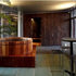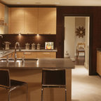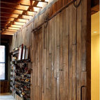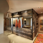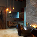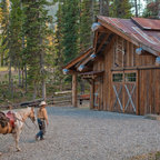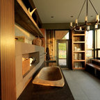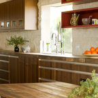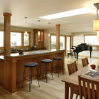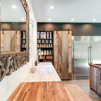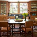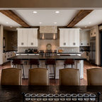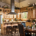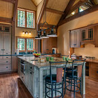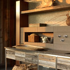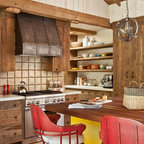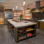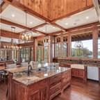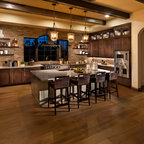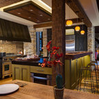 Свежая идея для дизайна: большая кухня - столовая в стиле рустика с плоскими фасадами, врезной раковиной, столешницей из акрилового камня и бетонным полом - отличное фото интерьера — Houzz