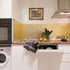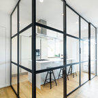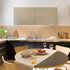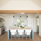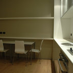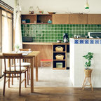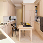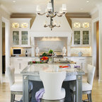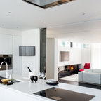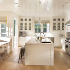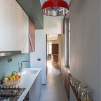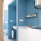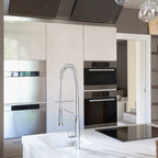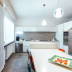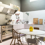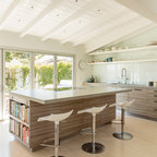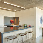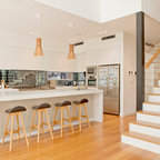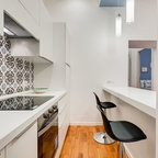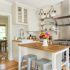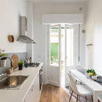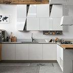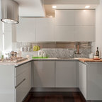 Неиссякаемый источник вдохновения для домашнего уюта: кухня в современном стиле с накладной раковиной, плоскими фасадами, белыми фасадами, столешницей из дерева, фартуком цвета металлик, фартуком из стекла и серым полом — Houzz