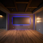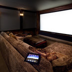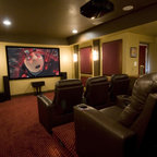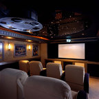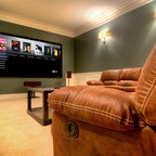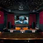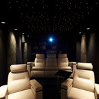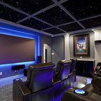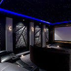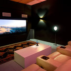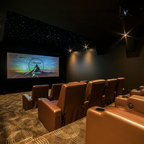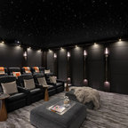 Новый формат декора квартиры: домашний кинотеатр в современном стиле с черными стенами, ковровым покрытием, телевизором на стене и черным полом — Houzz