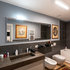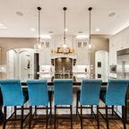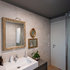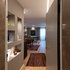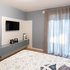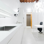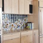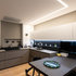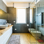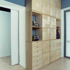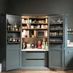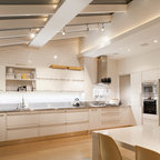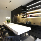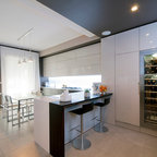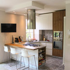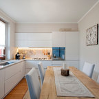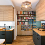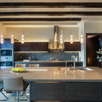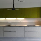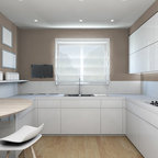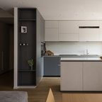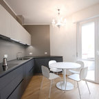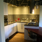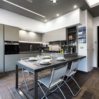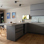 Свежая идея для дизайна: угловая кухня - столовая в современном стиле с одинарной раковиной, плоскими фасадами, серыми фасадами, черным фартуком, светлым паркетным полом и серой столешницей - отличное фото интерьера — Houzz