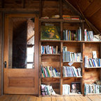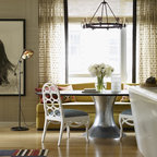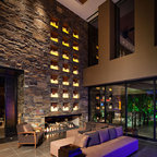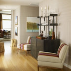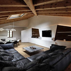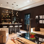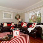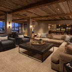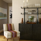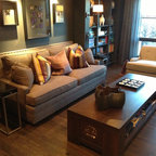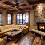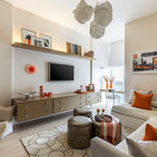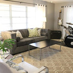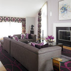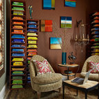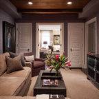 Пример оригинального дизайна интерьера: гостиная комната в стиле фьюжн с коричневыми стенами без камина —