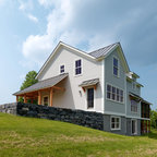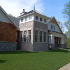 Part of the fun was in seeing what happened when a broad gabled volume was bent to respond to the contours of the site and to begin to suggest an outdoor space on the water side. Keeping the gable roof un-bent while putting a crook in the plan resulted in some curious volumes and unexpected shapes, which you discover as you move around the house.