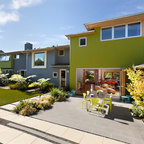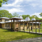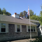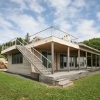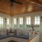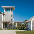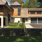 SeaBend is sited dramatically on a bluff, embracing a commanding view of a New England. The house is long and narrow, mostly one room deep, so that all the major rooms are open to both the north water views and the south sun, with breezes blowing through. The plan is geared to informal living, with the kitchen in the center to serve both indoor and outdoor living areas.