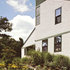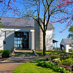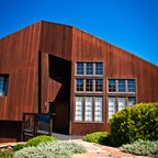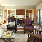 SeaBend is sited dramatically on a bluff, embracing a commanding view of a New England. The house is long and narrow, mostly one room deep, so that all the major rooms are open to both the north water views and the south sun, with breezes blowing through. The plan is geared to informal living, with the kitchen in the center to serve both indoor and outdoor living areas.