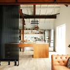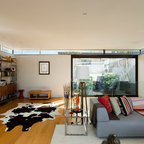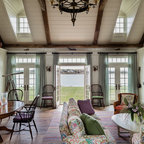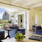 SeaBend is sited dramatically on a bluff, embracing a commanding view of a New England. The house is long and narrow, mostly one room deep, so that all the major rooms are open to both the north water views and the south sun, with breezes blowing through. The plan is geared to informal living, with the kitchen in the center to serve both indoor and outdoor living areas.