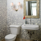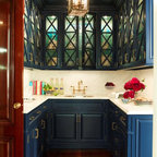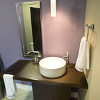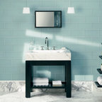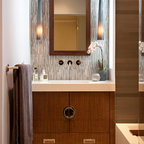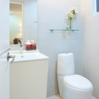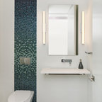Свежая идея для дизайна: туалет в современном стиле с плиткой кабанчик, полом из мозаичной плитки, белыми стенами, врезной раковиной, синей плиткой, белой плиткой и белой столешницей - отличное фото интерьера — Houzz